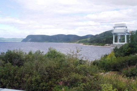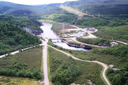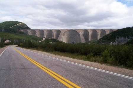 dam, you can see the road leading south to Baie-Comeau. The gray
